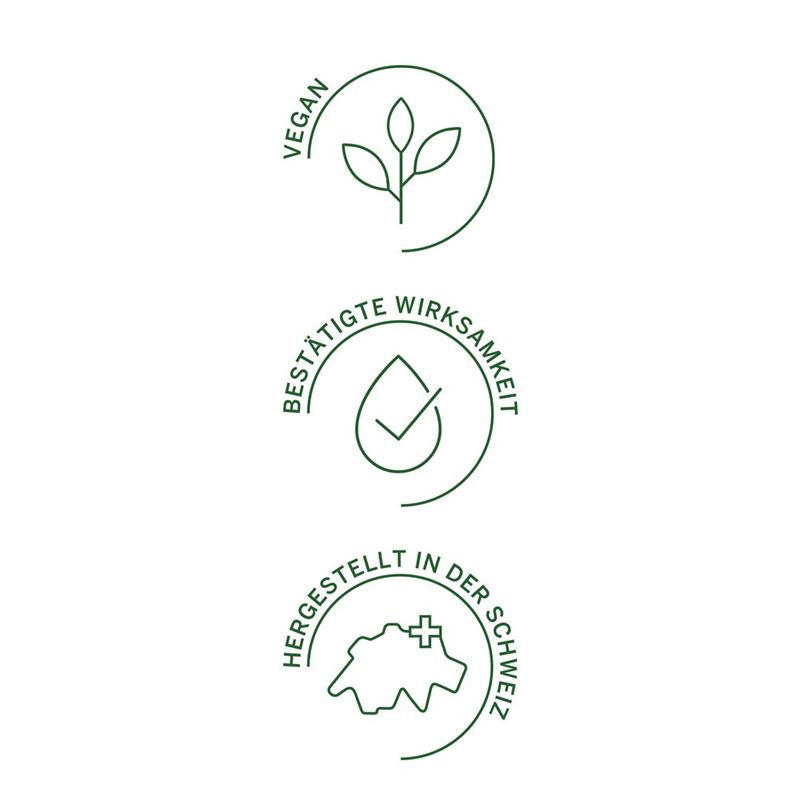 Öl-Kapsel Zutaten: Perillaöl, Algenöl, modifizierte Maisstärke, Feuchthaltemittel: Glycerin; Goldhirseöl, Stabilisator: Carrageen, Natriumphosphate; D-alpha-Tocopherol. Kräuter-Kapsel Zutaten: Grüntee-Extrakt (41 %), Füllstoff: microkristalline Cellulose; L-Ascorbinsäure, Maisstärke, Stabilisator: Polyvinylpyrrolidon, Polyvinylpolypyrrolidon; Sanddornpulver, Schweizer Kräutermischung (2 %), Calcium-D-pantothenat, Nicotinamid, Stabilisator: Hydroxypropylcellulose, Hydroxypropylmethylcellulose; Trennmittel: Siliziumdioxid, Magnesiumsalze der Speisefettsäuren; Überzugsmittel: Talkum; Zinkcarbonat, Calciumcarbonat, Pyridoxinhydrochlorid, Riboflavin-5’-phosphat (Natrium), Thiaminhydrochlorid, Pteroylglutaminsäure (Folate), D-Biotin, Cyanocobalamin, Natriumselenat, Farbstoffe: Kupferkomplexe der Chlorophylle und Chlorophylline. Nährwerte pro Kapsel: Polyphenole 160mg davon Catechine 90mg.