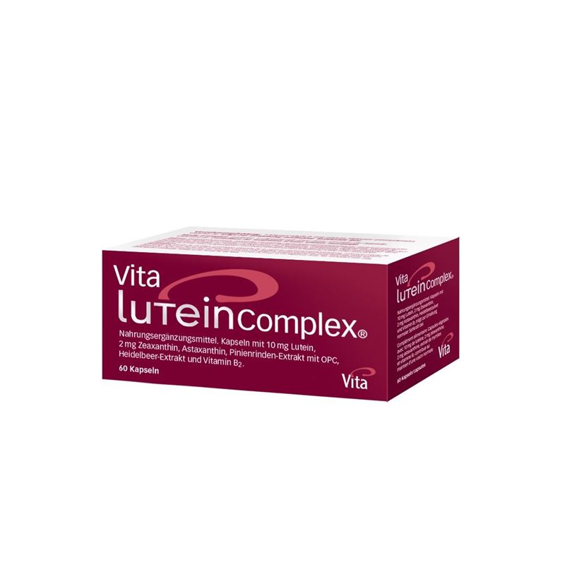 Nahrungsergänzungsmittel. Kapseln mit 10 mg Lutein, 2 mg Zeaxanthin, Astaxanthin, Pinienrinden-Extrakt mit OPC, Heidelbeer-Extrakt und Vitamin B2. Trägt zur Erhaltung normaler Sehkraft bei.